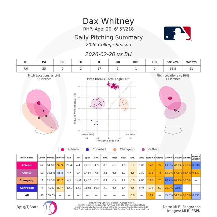 Facing Baylor in the Round Rock Classic, Whitney dazzled as he struck out 17 batters in seven innings on just 96 pitches. Thanks to the stadium having Statcast, we know Whitney threw 62 four-seam fastballs that averaged 97.9 MPH. That type of heat was too much for Baylor as they whiffed against the four-seamer at a 75.9(!) percent clip, which is a percentage I don't recall seeing on fastballs. For fun, Whitney mixed in a cutter/slider (I think there’s enough horizontal break to call it a slider), a sinker, a changeup, and a curveball.